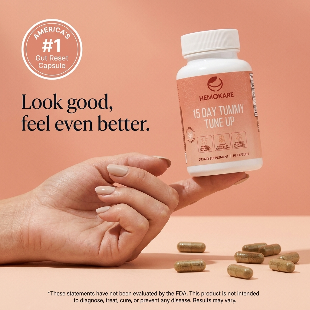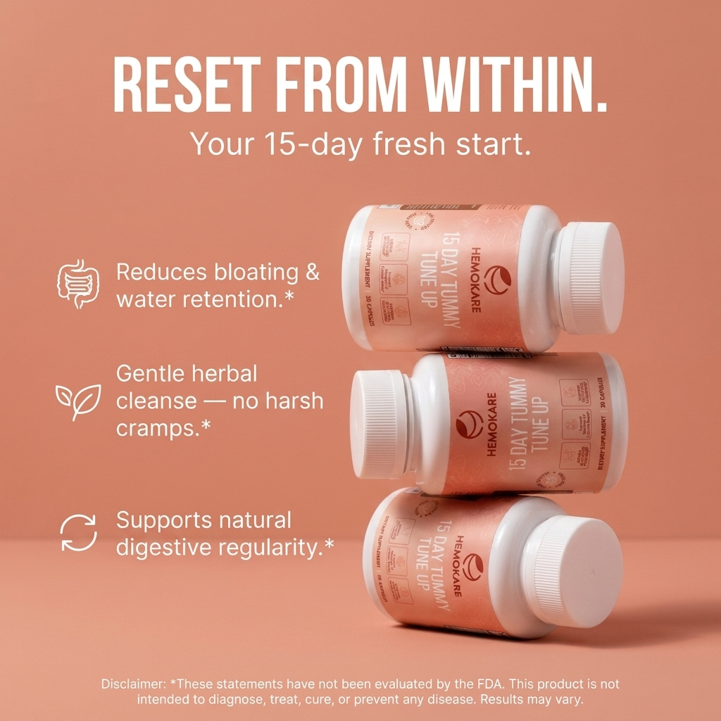 15-Day Tummy Tune-Up is a gentle herbal cleanse that resets your digestive system in just 2 weeks. Real herbs, real fiber, real probiotics — no harsh laxatives, no cramps, no mystery "detox" tea drama.